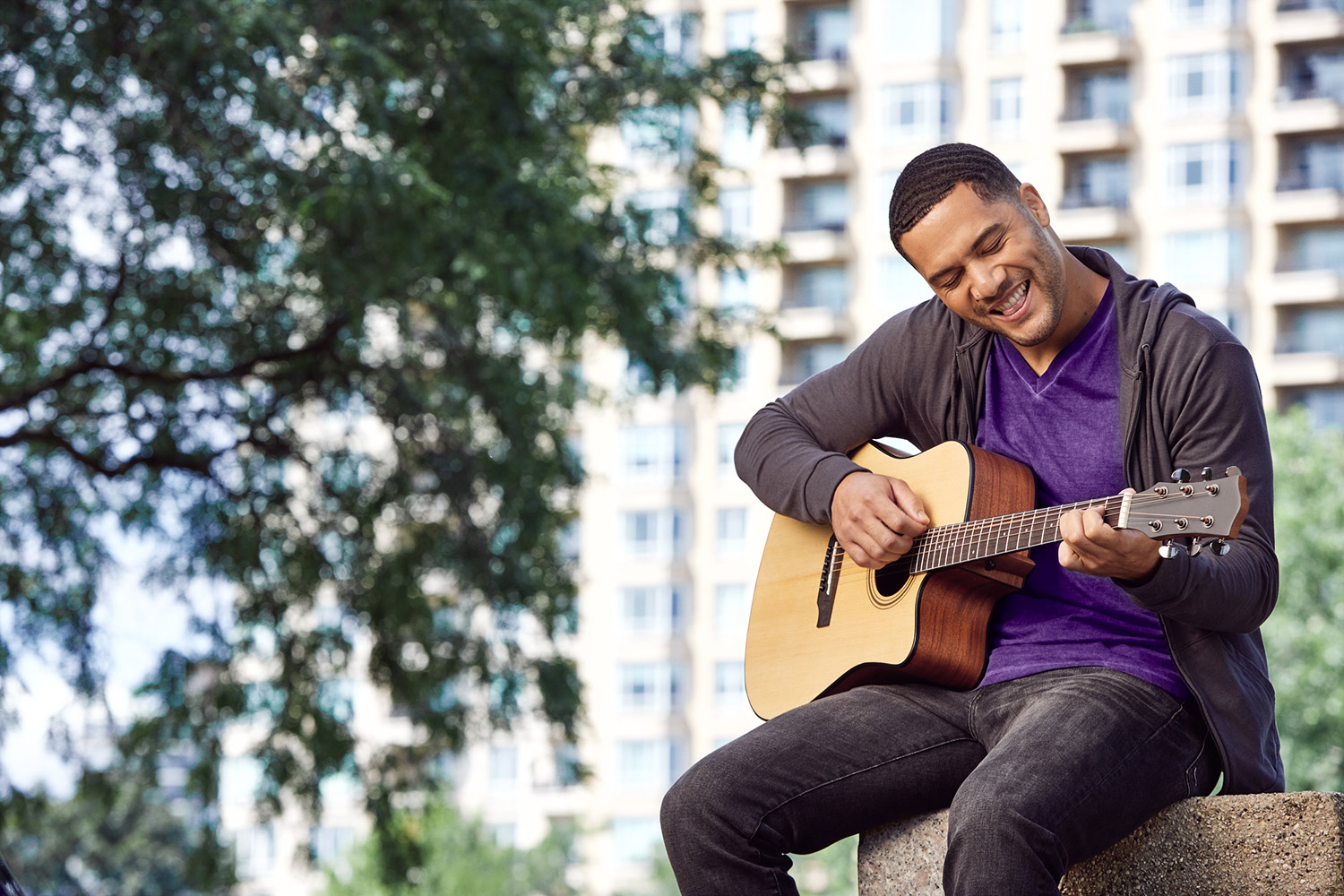 July 23, 2025 In pharma-campaign-chicago-producer-print–outdoor-exercise-Oxybate_Lying_Down_ A man sits in a park and plays the guitar.